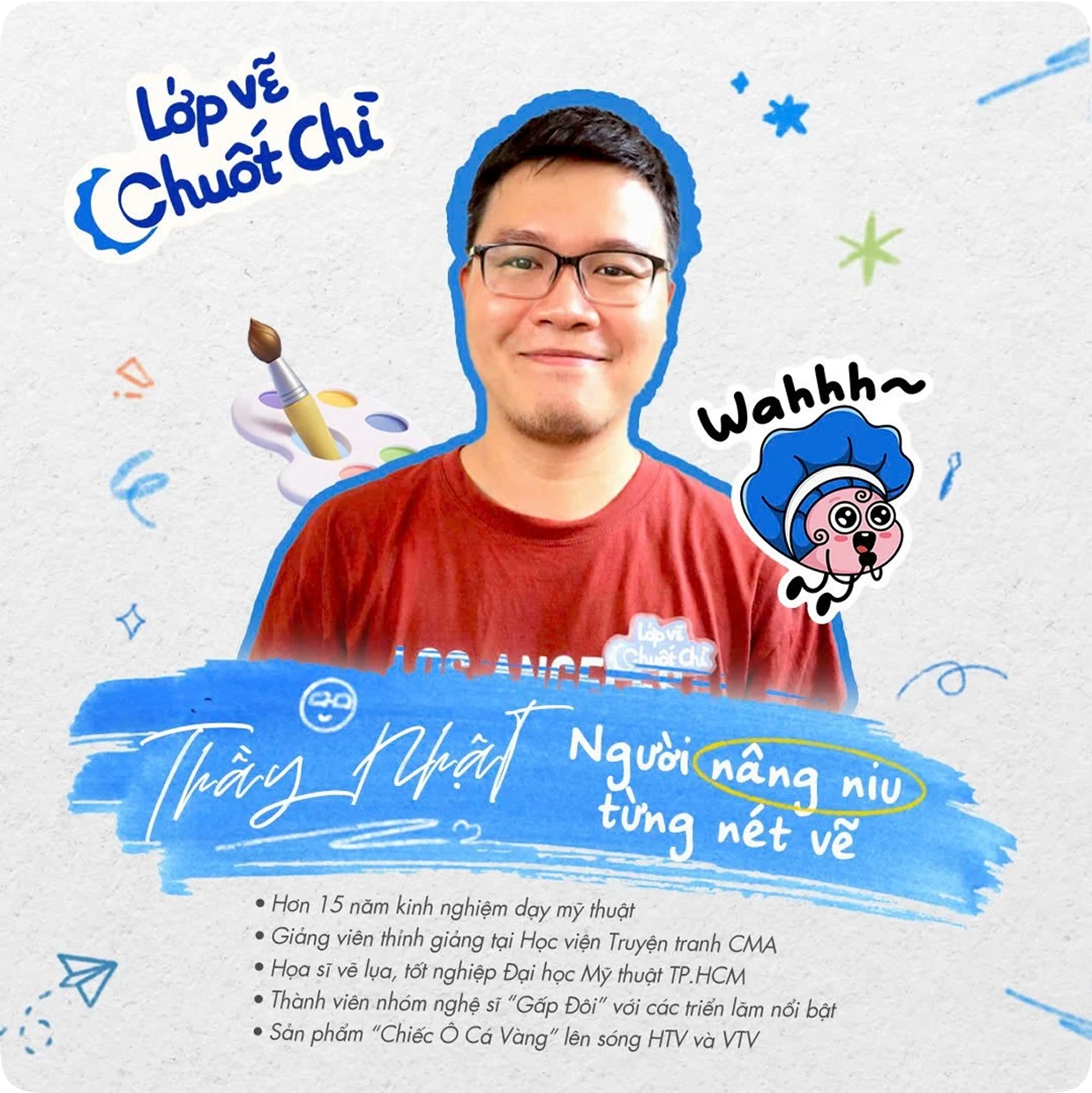 Đứng sau đội ngũ giảng viên của Chuốt Chì là thầy Nhật – một họa sĩ chuyên nghiệp, người đã dành hơn 15 năm gắn bó với nghệ thuật và giáo dục mỹ thuật. Tuy không trực tiếp đứng lớp, thầy là người định hướng chuyên môn, đào tạo và tiếp lửa sáng tạo cho đội ngũ giáo viên tại Chuốt Chì.