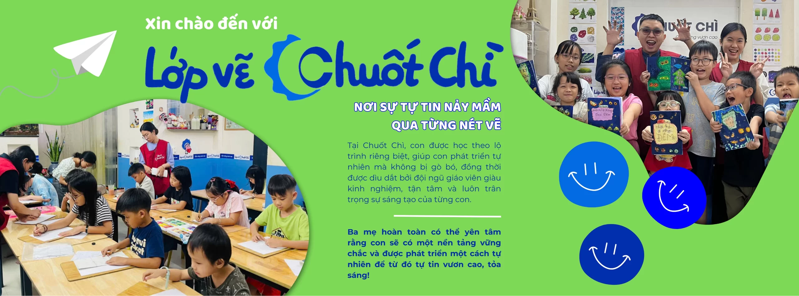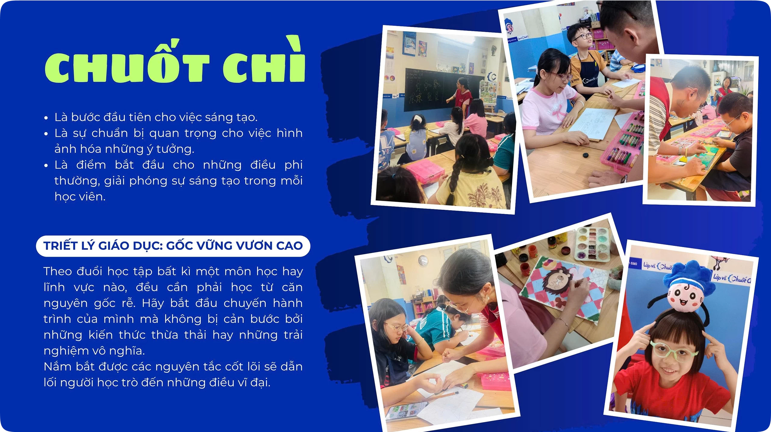 Chuốt Chì ra đời từ một ước mơ giản dị nhưng mạnh mẽ: xây dựng một không gian mà mỗi bé đều được tự do thể hiện cá tính, cảm xúc, và lớn lên với sự tự tin thông qua hội họa. Không kiểm tra, không bài tập về nhà, không áp lực điểm số – tại Chuốt Chì, con sẽ có một hành trình sáng tạo thật sự thoải mái và vui vẻ. Đây là nơi mỗi bé đều có một lộ trình cá nhân hóa, phù hợp với độ tuổi, sở thích và năng lực riêng biệt.